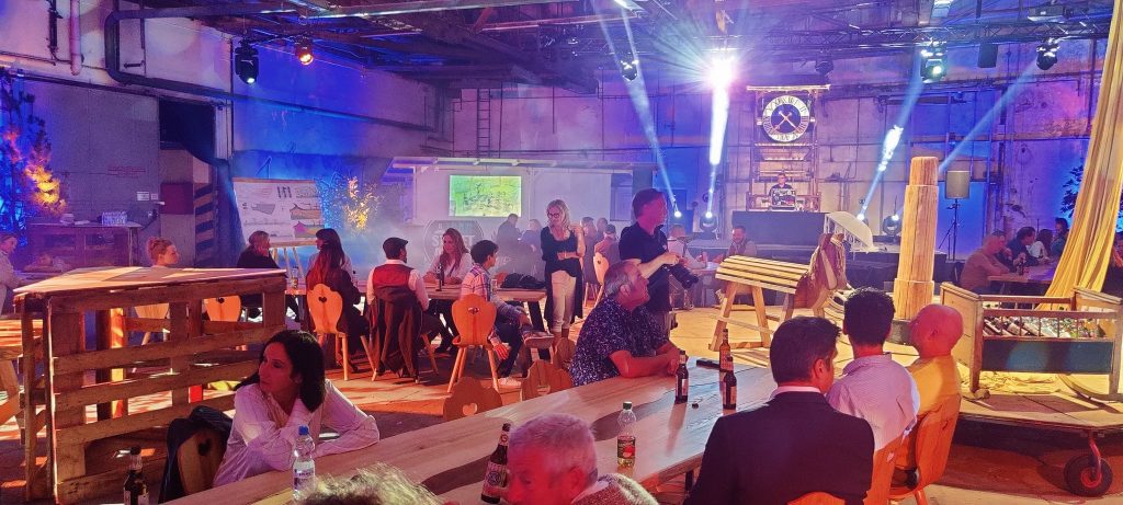 Das beeindruckende Moraltgelände mit seiner 100.000 m² großen Fläche wurde dabei als zukünftiges Innovationszentrum vorgestellt. Dank der kreativen Raumgestaltung von Axel Berger (IsarStreetArt), die mit einer zentralen Drehbühne und projizierten Wasserinstallationen das Motto des Abends „Alles im Fluss, vom Sägewerk zur Zukunftswerkstatt“ lebendig werden ließ, bot sich eine einmalige Kulisse.