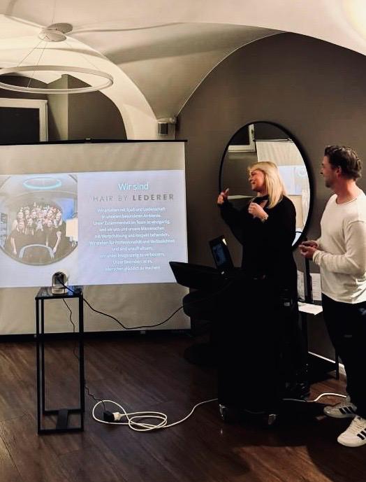 Seit über 21 Jahren steht das Unternehmen für hochwertige Haarkunst, Stil und Innovation. Besonders spannend für die Teilnehmenden waren die persönlichen Einblicke in die Entstehungsgeschichte des Unternehmens. Martina Lederer berichtete offen und authentisch, wie sich Hair by Lederer über die Jahre entwickelt hat, welche Ideen und Visionen dahinterstanden und welche Schritte notwendig waren, um den Betrieb erfolgreich aufzubauen und kontinuierlich weiterzuentwickeln.