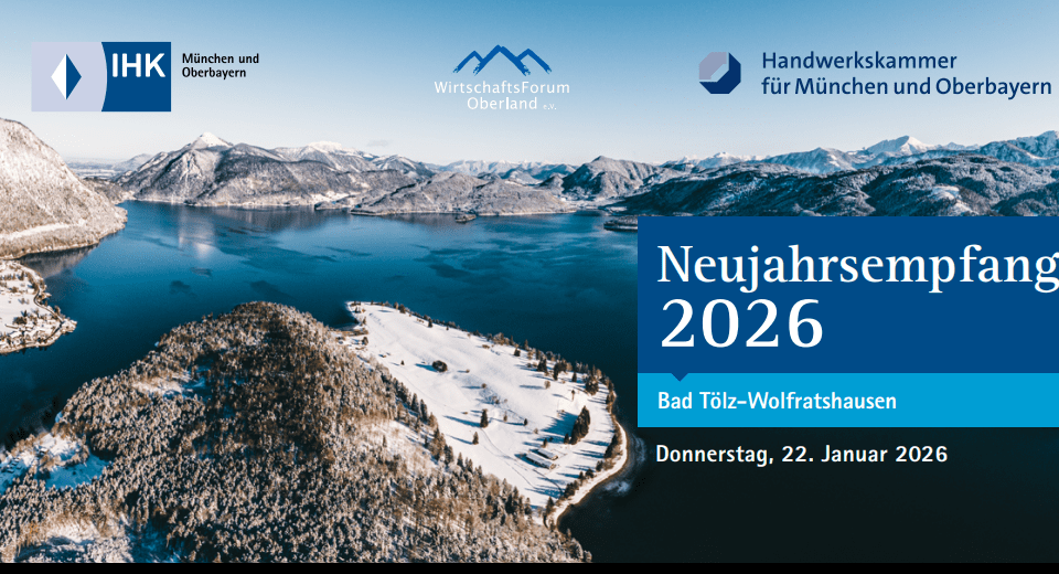 Eine intakte, breit aufgestellte und vor allem gut vernetzte Wirtschaft ist die Basis einer nachhaltigen Gesamtentwicklung für den Landkreis Bad Tölz-Wolfratshausen. Um den Austausch zwischen Wirtschaft, Gesellschaft und Politik im Landkreis zu fördern und dabei neue Perspektiven und Impulse in die Diskussion einzubringen, laden Sie der IHK-Regionalausschuss Bad Tölz-Wolfratshausen, die HWK für München und Oberbayern und das Wirtschaftsforum Oberland herzlich zu einem gemeinsamen Neujahrsempfang ein.