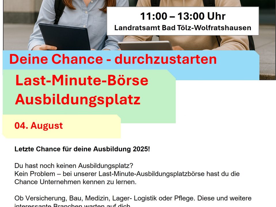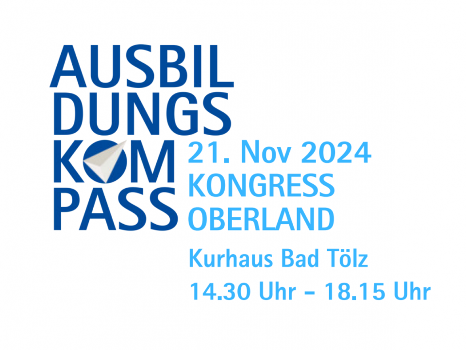 Der 1. Ausbildungskompass Kongress Oberland bringt landkreisübergreifend Schulleitungen, Lehrkräfte, Koordinatoren für berufliche Orientierung und Verantwortliche von Ausbildungsbetrieben zusammen, um aktuelle Entwicklungen zu diskutieren.Du hast noch keinen Ausbildungsplatz gefunden? Kein Problem! Komm zur Last-Minute-Ausbildungsplatzbörse im Landratsamt Bad Tölz-Wolfratshausen.